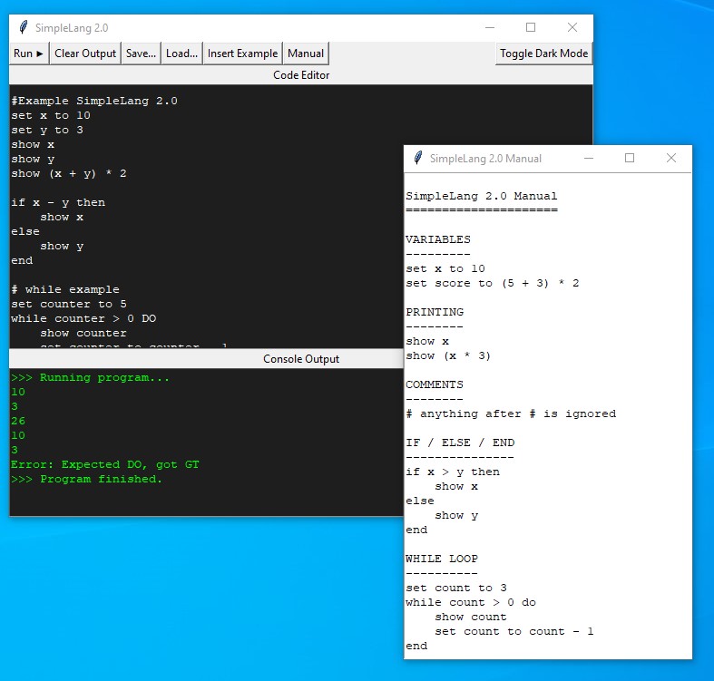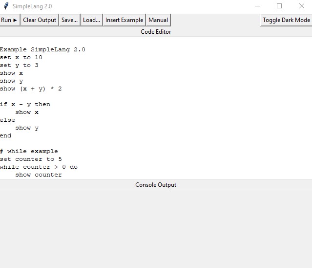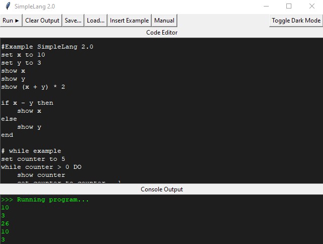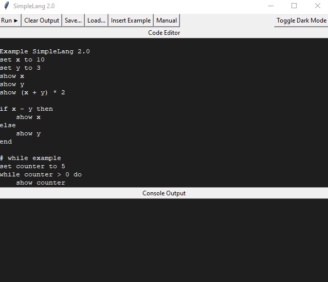 Codez3 is a simple, beginner-friendly IDE designed to help you learn programming with a custom language called SimpleLang. With Codez3, you can write, run, and experiment with code directly in a user-friendly graphical interface.